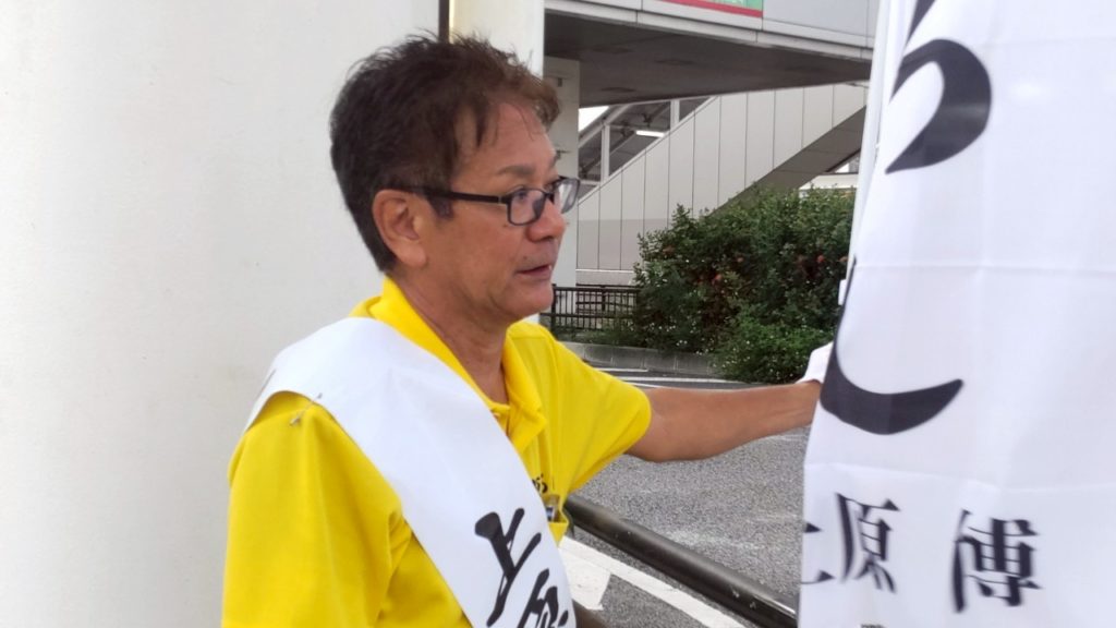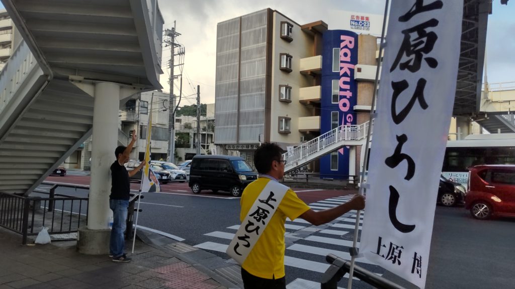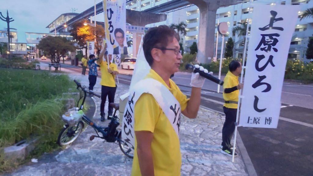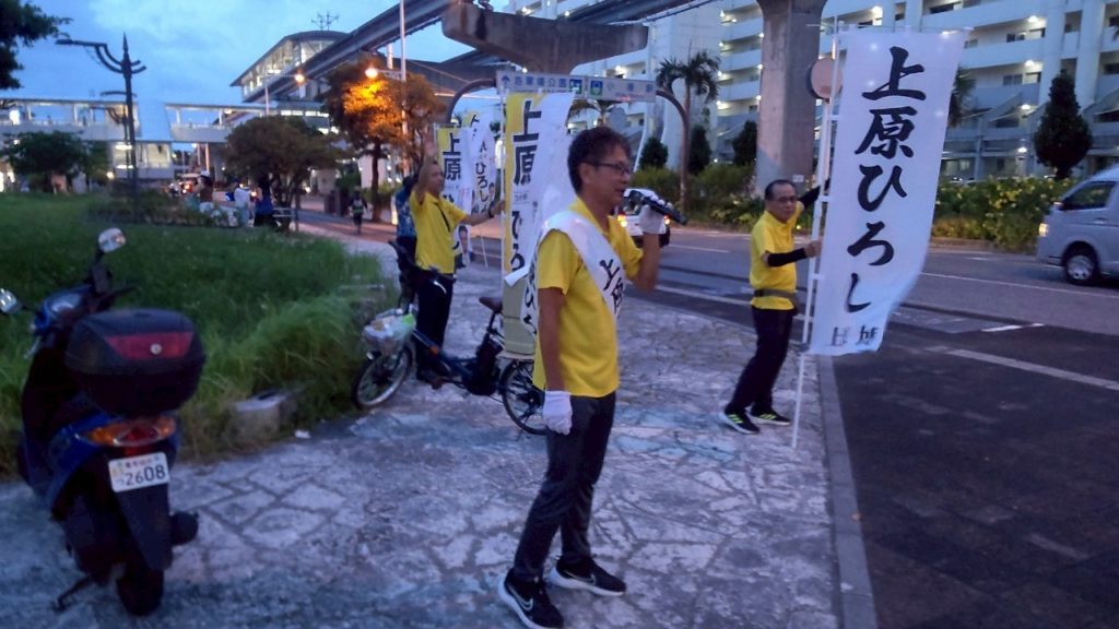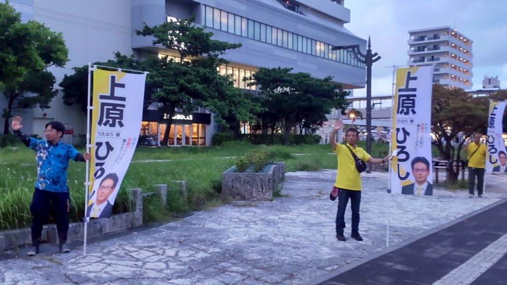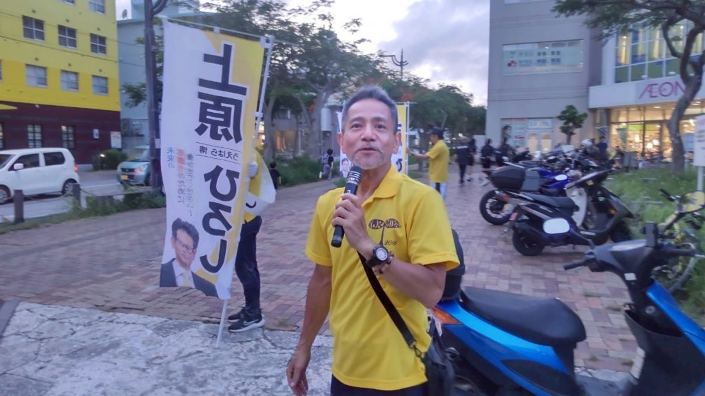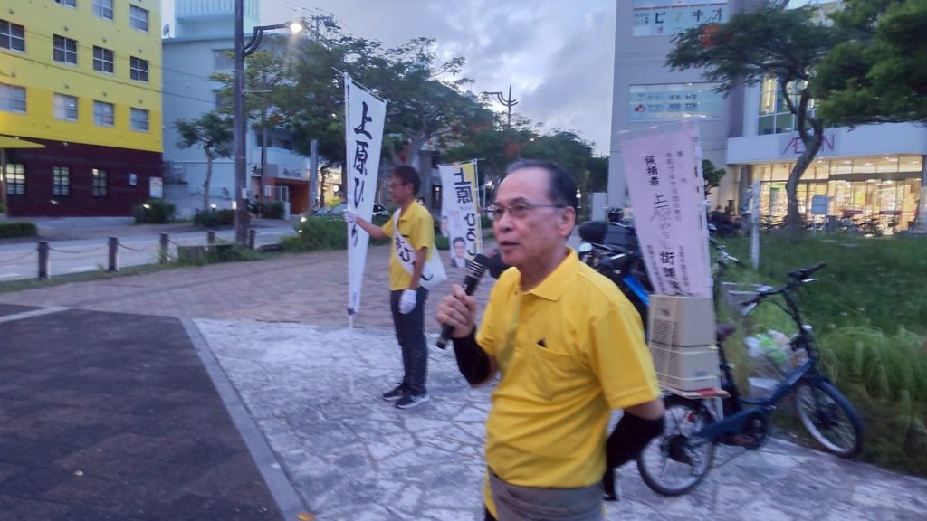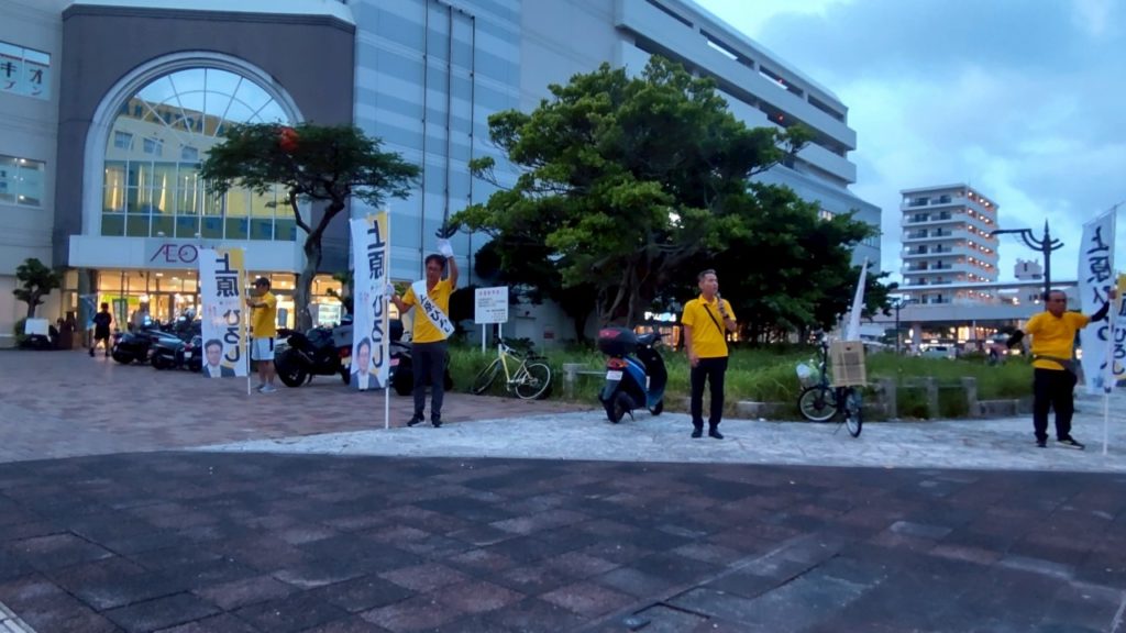イオン那覇店前では、上原ひろし、大山選対本部長、上原兼一後援会長が街頭演説を行いました。