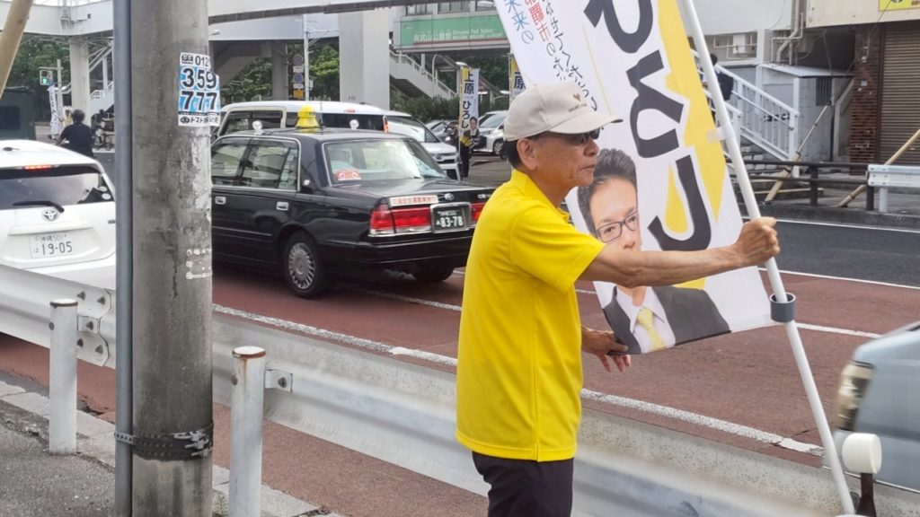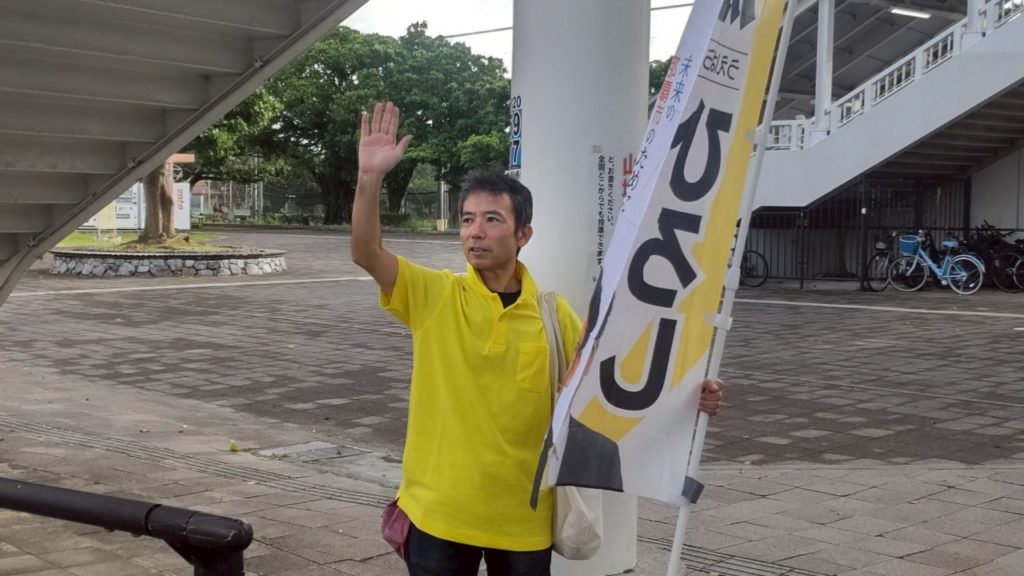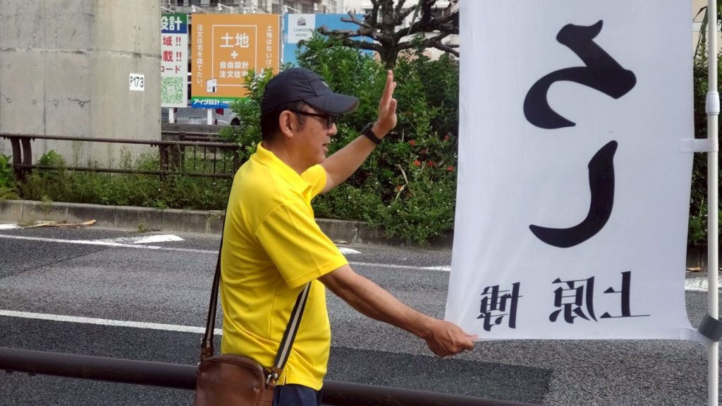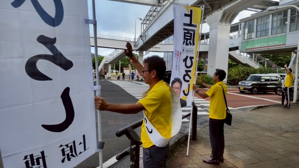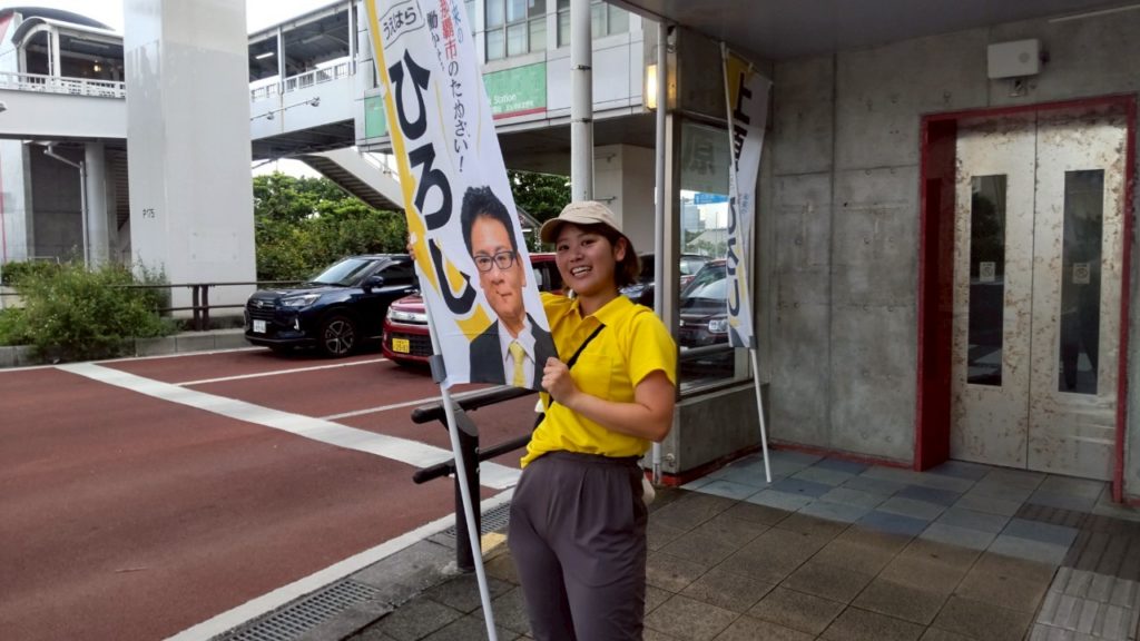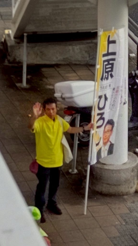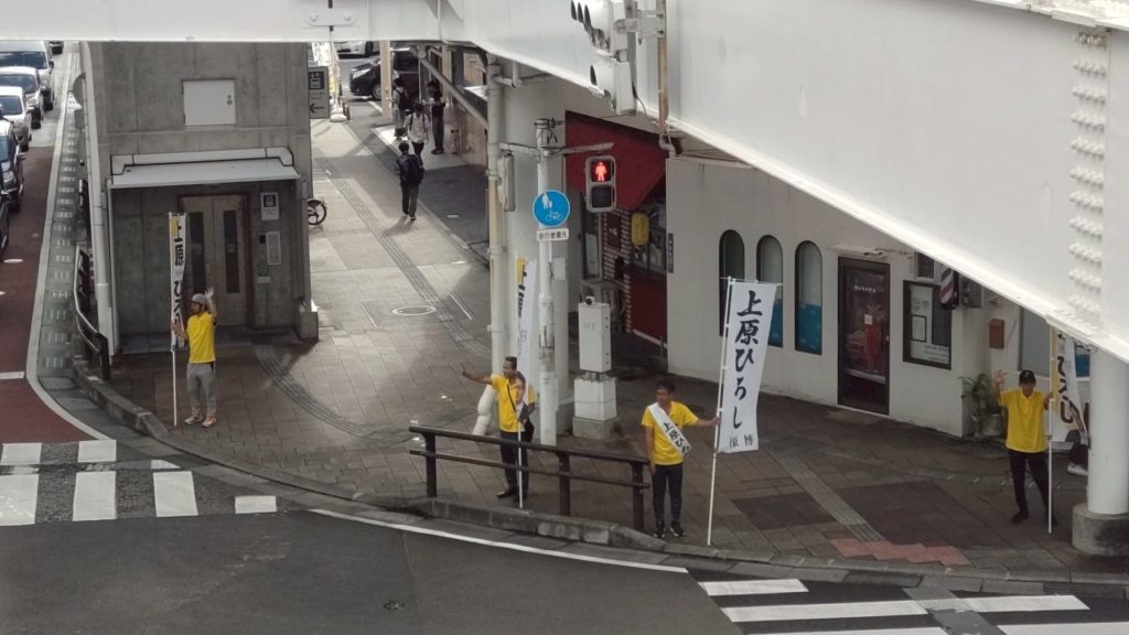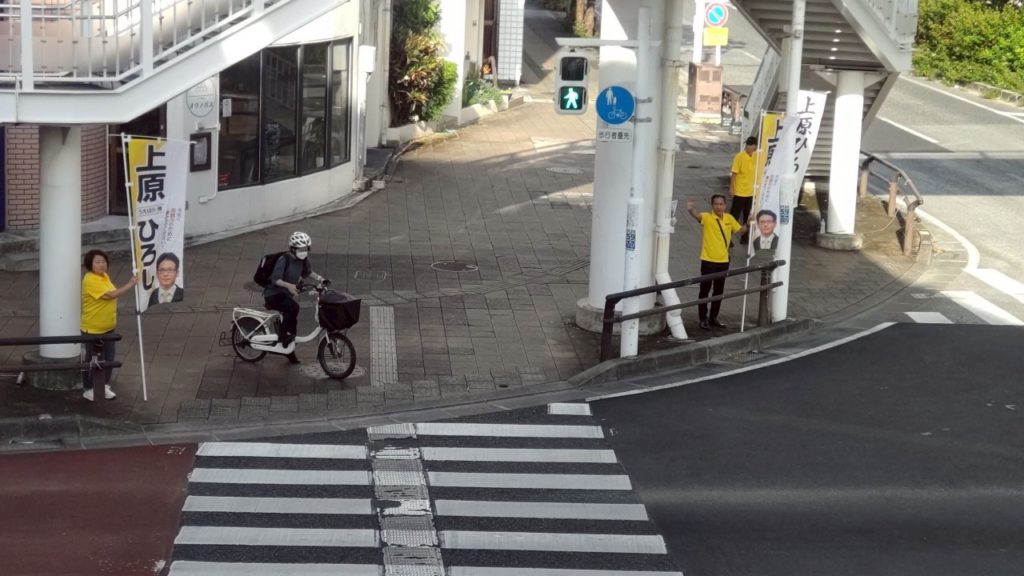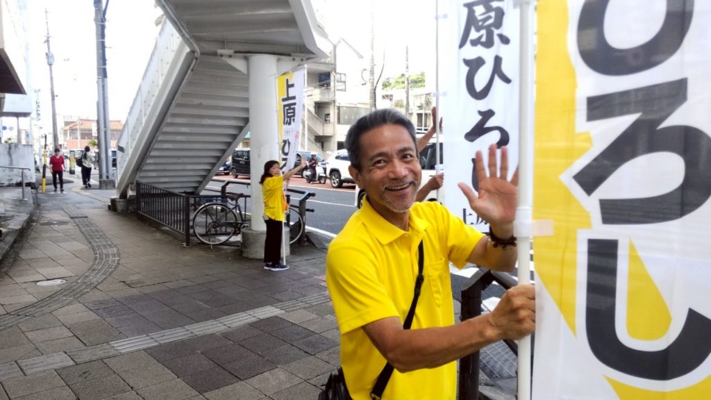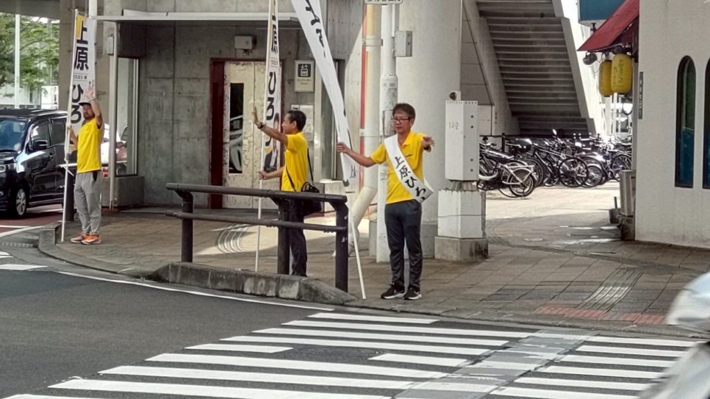 黄色いポロシャツの「上原ひろし応援隊」を見かけましたら、あたたかいご声援をよろしくお願いします。